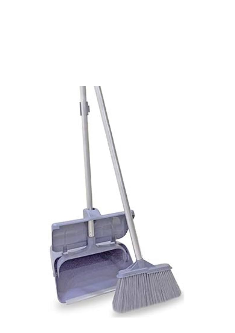 lobby dustpan sets with brooms. One set will have a standard long-handled broom and a dustpan with wheels, while the other will feature a shorter broom with a T-shaped handle and a deeper dustpan. Both sets will be positioned against a plain white background.